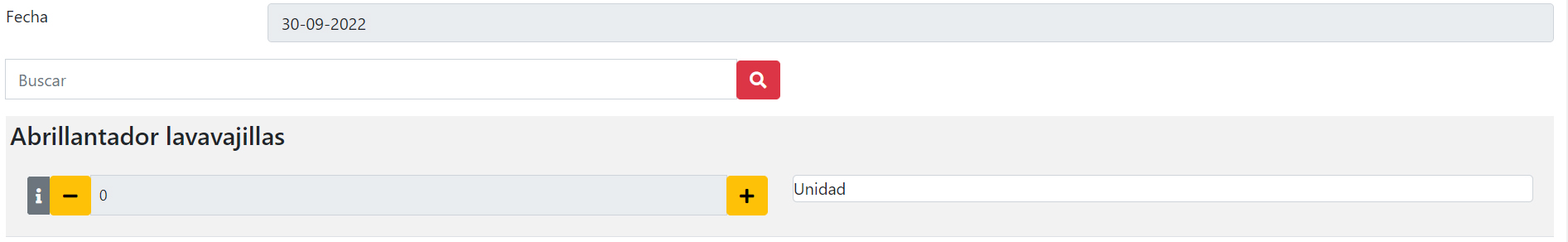 2. Paso, entre paréntesis tiene el stock del producto (si lo tiene activado en configuración), nombre del producto y botón con información del producto, botones de Menos y Más para las cantidades, tipo de producto (unidad, botella, caja, etc.), así en todos los productos Pedidos